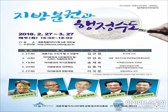 세종시 인재육성평생교육진흥원은 오는 27일부터 한달동안 매주 화요일 오후 4시 시청 여민실에서 집현전 아카데미 '지방분권과 행정수도'를 개강한다고 25일 밝혔다.