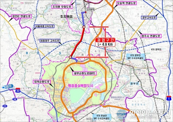 | 행복도시건설청이 8차선 확장을 추진하고 있는 조치원 연결도로 구간도.(사진제공=행복도시건설청) |