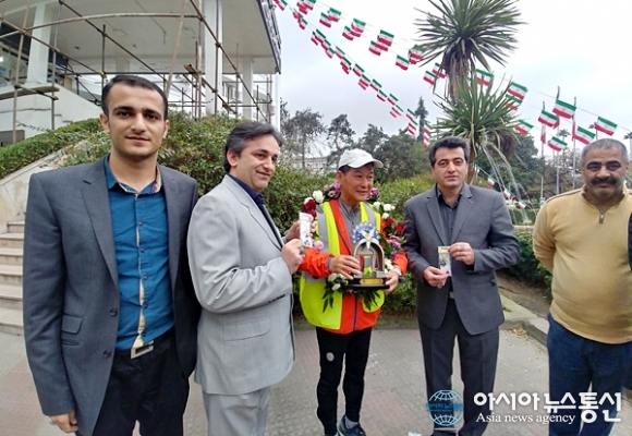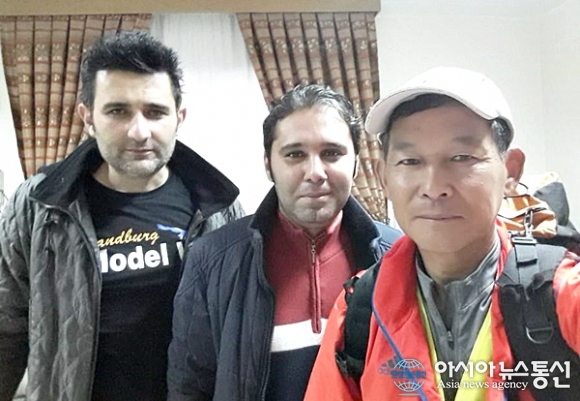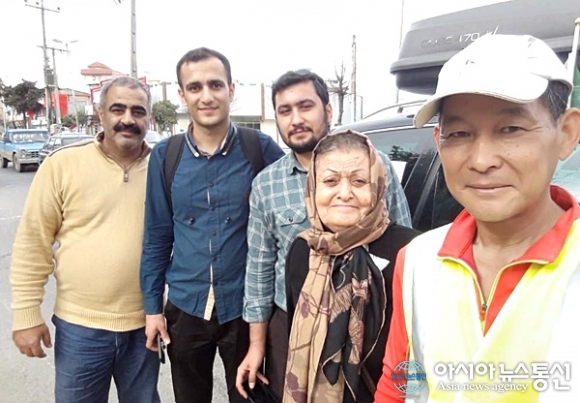 | 이란 바볼에서 무스타파(왼쪽 두번째)를 비롯한 주민들과 기념사진을 찍고 있다.(서진=강명구) |