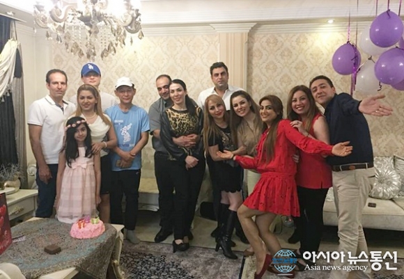 | 마단나의 조카 니샤의 9살 생일 파티에 초대받아 참석자들과 기념사진을 찍고 있다.(사진=강명구) |