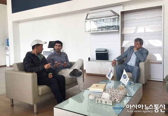 | 지원차량 엔진 오일이 새서 수리를 맞기고 만난 해당 차량 서비스센터 CEO와 면담중.(사진=김창건) |