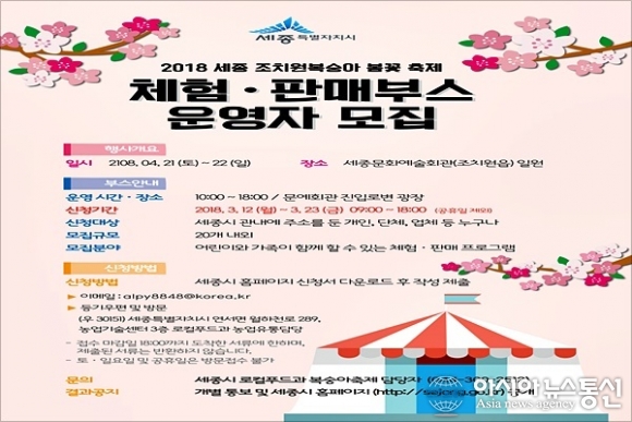 세종시가 다음달 21~22일 열리는 복숭아 봄꽃축제장 체험 및 판매부스 운영자를 모집한다.