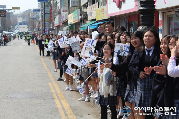| 26일 대한민국 동계패럴림픽 도전사의 첫 금메달 주인공 신의현 선수(38·창성건설)의 환영행사가 고향인 충남 공주시에서 시민들의 열렬한 환영 속에서 육군 제32사단에서 지원한 의전차량을 타고 시청 광장부터 공주고등학교 앞, 중동교차로를 거쳐 주무대인 산성시장 문화공원까지 이동하고 있다./아시아뉴스통신=조문현 기자 |