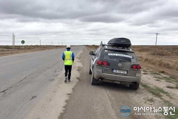 | 'Peace Marathon'이라 새겨진 차가 사막을 달리는 강명구 선수를 에스코트하고 있다.(사진=김창건) |