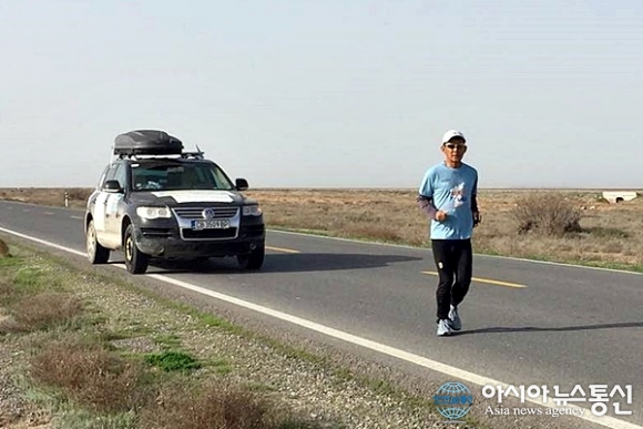 | 이란 고르간 평야의 구름한 점 없는 황량한 사막을 달리고 있는 평화마라토너 강명구.(사진=김창건) |