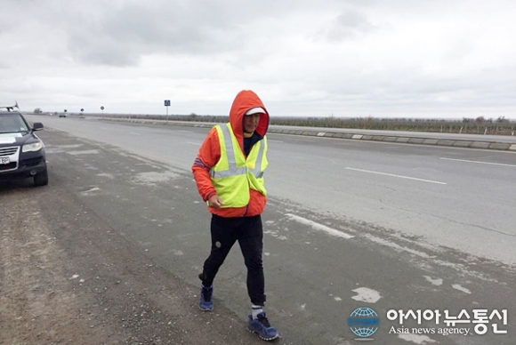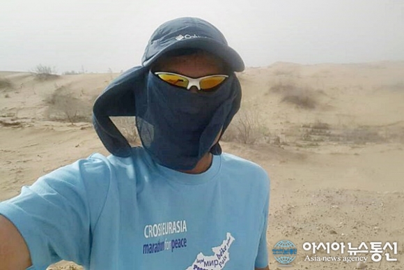 | 모래바람 휘날리는 황량한 카라쿰 사막 한복판에서 가슴으로 신들린 듯 달리고 있다.(사진=김창건) |