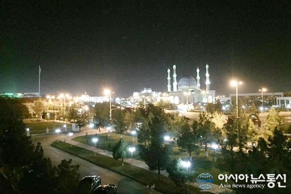 | 투르크메니스탄 마리 Margush 호텔에서 바라본 투르반 굴리 하지모스크의 멋진 야경.(사진=김창건) |