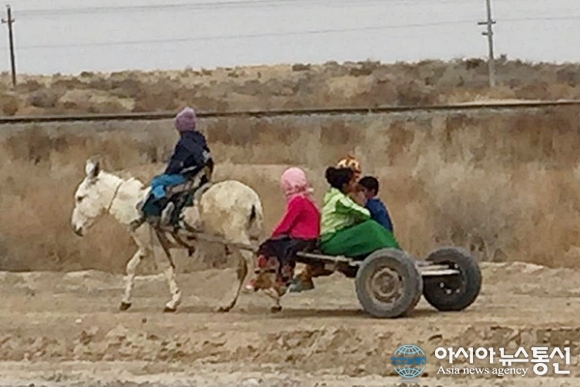 | 투르크메니스탄 마리에서 바이라말리로 가는 길에 만난 마차에 한 가족이 타고있다.(사진=김창건) |