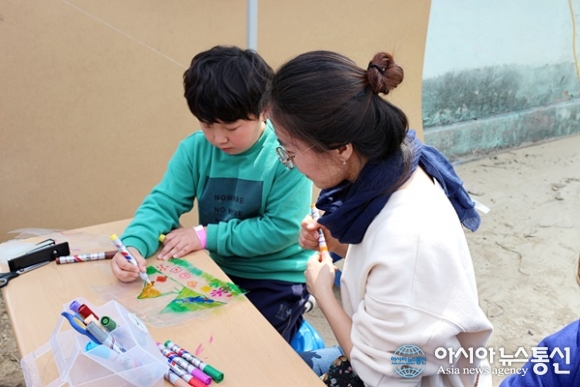 | 31일 낮 기온이 22도까지 올라가는 완연한 봄을 맞아 세종시 조치원 구 정수장터에서 열린 '에코예술놀이터'에서 한 어린이가 엄마가 보는 가운데 그림 솜씨를 뽐내고 있다./아시아뉴스통신=홍근진 |