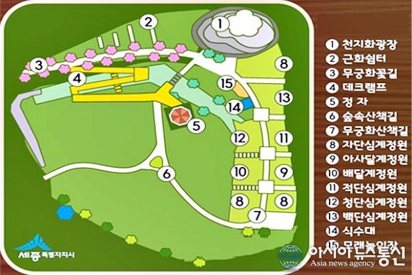 | 세종시가 9일 한솔동 첫마을 세종보 인근에 개장한 '참샘 무궁화 정원' 안내도.(사진제공=세종시청) |