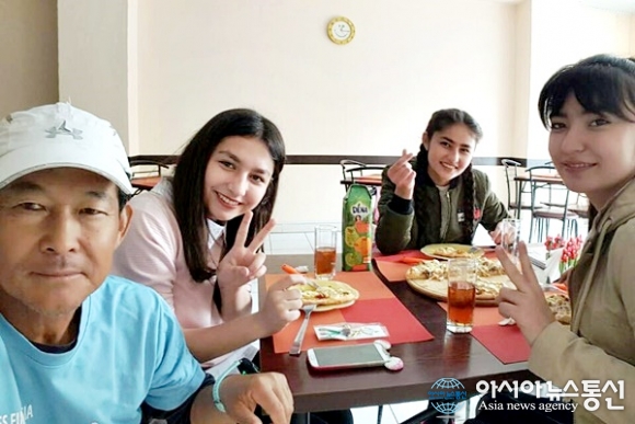 | 우즈베키스탄 Zarafshon으로 가는 길에 피자 가게에서 만난 여학생들과 기념 촬영.(사진=강명구) |