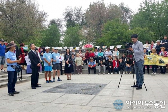 | 우즈베키스탄 타슈켄트 바부르 서울공원에서 평화문화제 사절단과 기념사진을 찍었다.(사진=강명구) |