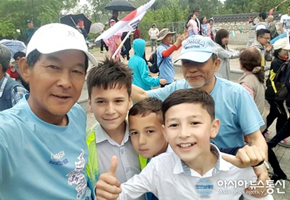 | 우즈베키스탄 타슈켄트 바부르 서울공원에서 열린 환영대회에서 어린이들과 기념촬영.(사진=강명구) |