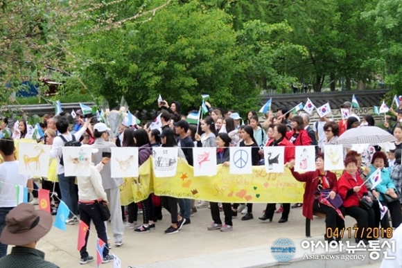 그랜드 미르 호텔 앞에서 시작된 평화행진은 바브로 공원까지 아이들부터 할머니 할아버지를 아우르는 현지동포와 고려인들의 평화한마당 열기로 가득 찼다.