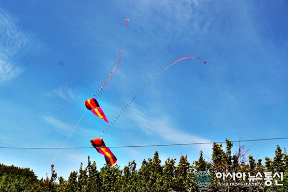 | 21일 세종시 문화예술회관일원에서 조치원복숭아 봄꽃축제가 열린 가운데 길게 이어진 연이 하늘 높이 날고 있다./아시아뉴스통신=홍근진 기자 |