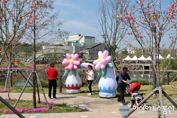 | 21일 세종시 문화예술회관일원에서 조치원복숭아 봄꽃축제가 열린 가운데 더운 날씨에 양산을 쓴 커플이 꽃모양 풍선 앞에서 사진을 찍고 있다./아시아뉴스통신=홍근진 기자 |