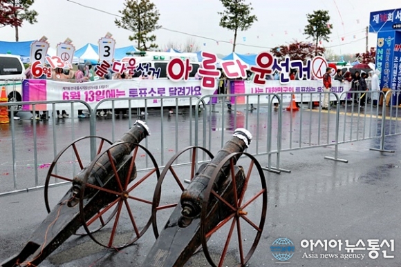 | 22일 세종시 복사꽃 마라톤대회가 열린 가운데 시민체육관 출발선에 도열해 있는 축포와 선관위 직원들. 선관위 직원들이 "6월 13일에는 투포소로 달려가요"라는 현수막을 들고 있다./아시아뉴스통신=홍근진 기자 |
