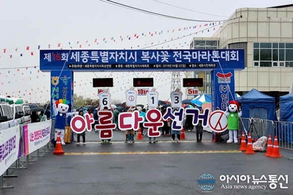 | 22일 세종시 복사꽃 전국마라톤대회가 시민체육관에서 출발을 앞두고 있는 가운데 선관위 직원들이 '아름다운 선거' 캠페인을 벌이고 있다./아시아뉴스통신=홍근진 기자 |