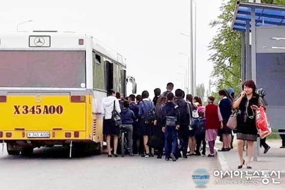 | 카자흐스탄 심켄트에서 Mashat로 가는 길에 정류장에서 버스를 타고 있는 학생들.(사진=김현숙) |