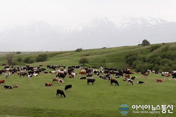 | 카자흐스탄 Abail로 가는 길에 초원 뒤로 자부글리 자연보호구역 설산이 보인다.(사진=김현숙) |