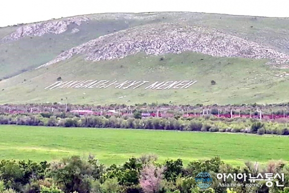 | 카자흐스탄 Mashat에서 Abail로 가는 길에 멀리 구릉 언덕에 돌로 새겨 놓은 지명.(사진=김현숙) |