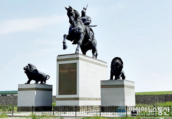 | 카자흐스탄 MAMBETULY에서 심켄트로 가는 길에 있는 말을 탄 가후만다라 장군상.(사진=김현숙) |