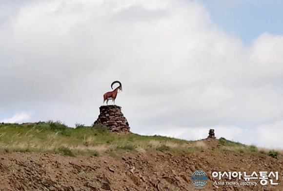 | 카자흐스탄 타라즈서 악출락으로 가는 길 언덕 돌무덤 위에서 먼 산을 보고 있는 산양.(사진=김현숙) |