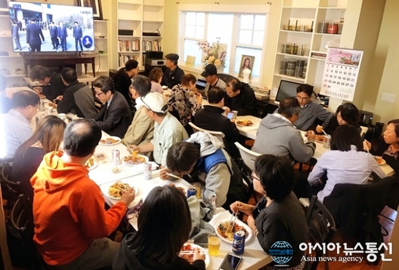 | 지난 27일 LA의 한 교회에 마련된 쉼터에 모여 식사하며 남북정상회담을 보고 있는 동포들.(사진=AOK) |