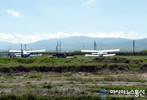 | 카자흐스탄 타라즈서 악출락으로 가는 길 한 경비행장에 쌍엽기 두 대가 대기하고 있다.(사진=김현숙) |
