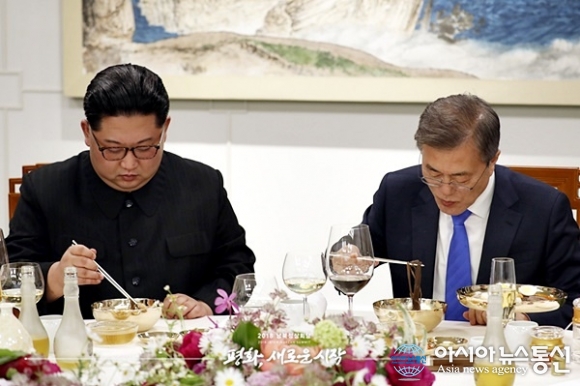 | 27일 문재인 대통령과 김정은 국무위원장이 만찬으로 옥류관 평양냉면을 먹고 있다.(사진=공동취재단) |