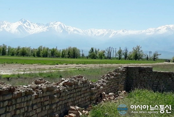 | 카자흐스탄 악출락서 Maldybay로 가는 길에 보이는 자바글리 설산이 한 폭의 그림 같다.(사진=김현숙) |