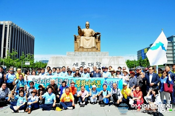 | 지난해 9월 서울 광화문 광장 세종대왕상앞에서 열린 유라시아 평화마라톤 출정식 모습.(사진=조직위) |