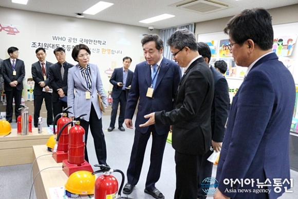 | 이낙연 국무총리가 4일 어린이 날을 하루 앞두고 세종시 조치원 대동초등학교를 방문, 안전체험 수업 참관에 앞서 소방안전 체험용 소화기를 둘러 보고 있다./아시아뉴스통신=홍근진 기자 |
