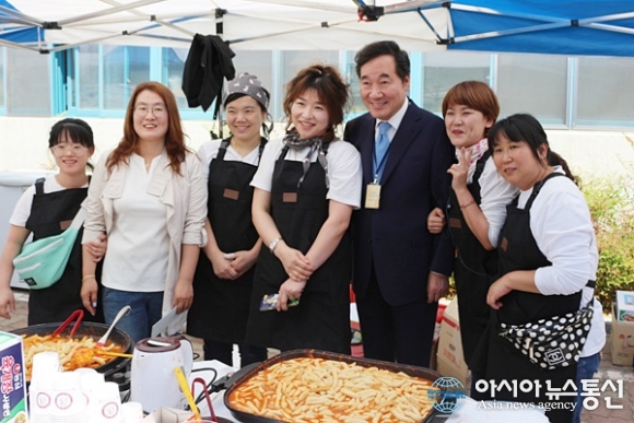| 이낙연 국무총리가 4일 어린이 날을 하루 앞두고 세종시 조치원 대동초등학교를 방문, 한마음 축제장에서 떡볶이를 나눠주고 있는 학부모들과 기념사진을 찍었다./아시아뉴스통신=홍근진 기자 |