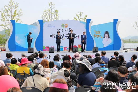 | 제96회 어린이날을 맞아 세종시 호수공원에서 열린 '어린이날 큰잔치' 기념식에서 이춘희 시장, 고준일 시의장, 최교진 교육감이 인사말을 하고 있다./아시아뉴스통신=홍근진 기자 |