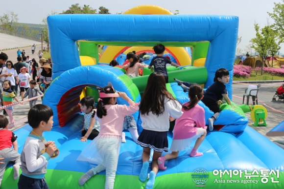 | 제96회 어린이날을 맞아 세종시 호수공원에 마련된 '어린이날 큰잔치' 행사장 에어바운스존에서 어린이들이 즐겁게 놀고 있다./아시아뉴스통신=홍근진 기자 |