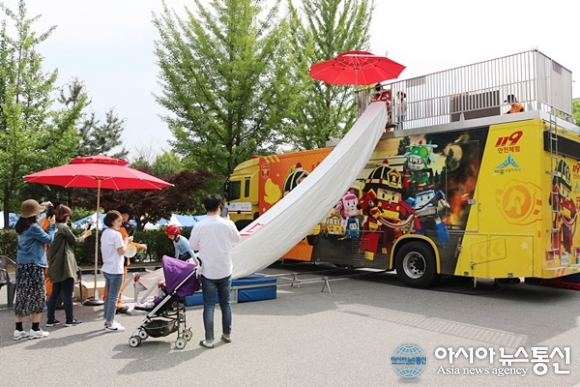 | 제96회 어린이날을 맞아 고려대학교 세종캠퍼스에서 열린 세종시 구도심 '어린이날 한마당' 행사에서 아이들이 소방본부 안전체험차량 구조대 비상탈출 체험을 하고 있다./아시아뉴스통신=홍근진 기자 |