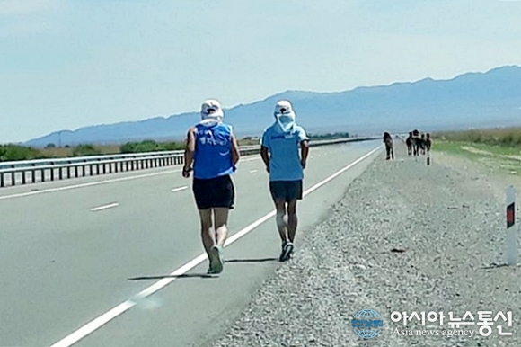 | 카자흐스탄 사막지대로 들어서는 길을 달리고 있는 강명구 선수와 강석준 원불교 교무.(사진=김현숙) |