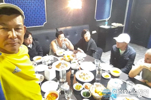 | 카자흐스탄 알마티 고려인들의 초대로 노래방식 개별룸에서 저녁식사를 마치고 인증샷.(사진=강명구 |