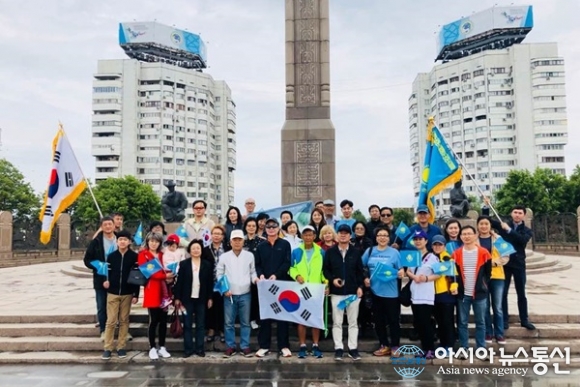 | 카자흐스탄 알마티 시청 앞 독립 기념탑에서 고려인들과 함께 마라톤 성공을 기원했다.(사진=김현숙) |