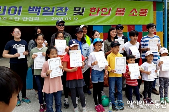| 카자흐스탄 알마라산 캠핑장에서 열린 어린이날 기념 평화통일 기원 백일장 입상자들.(사진=김현숙) |