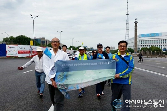 | 카자흐스탄 알마티에서 고려인들과 함께 도심 6km를 행진하며 마라톤 성공을 기원했다.(사진=김현숙) |