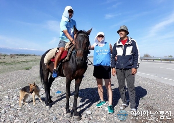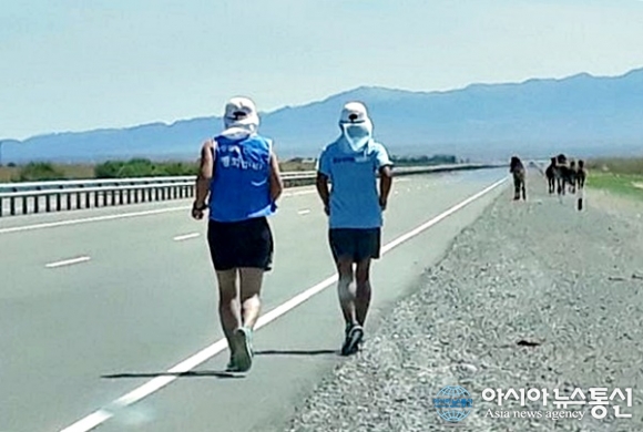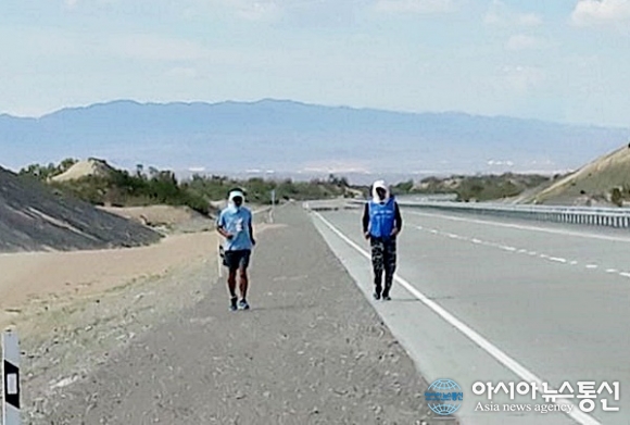 | 카자흐스탄 사막지대로 들어서는 길을 달리고 있는 강명구 선수와 강석준 원불교 교무.(사진=김현숙) |