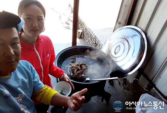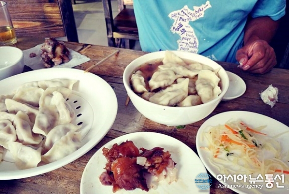 | 중국에 입국하자마자 허기진 배를 채우려 들어간 식당에서 맛있는 음식을 먹고 있다.(사진=강덕원) |