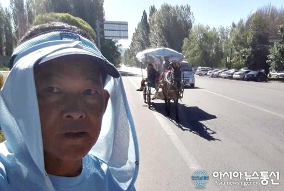 | 중국 서북부 신장 위그르 자치주의 길에 자동차가 많은 가운데 마차를 타고 가는 주민.(사진=강명구) |