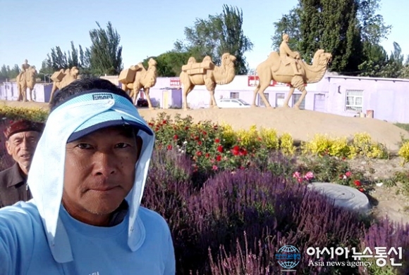 | 중국 서북부 신장 위그르 자치주 이닝 근처에 서있는 낙타 동상을 배경으로 기념 촬영.(사진=강명구) |