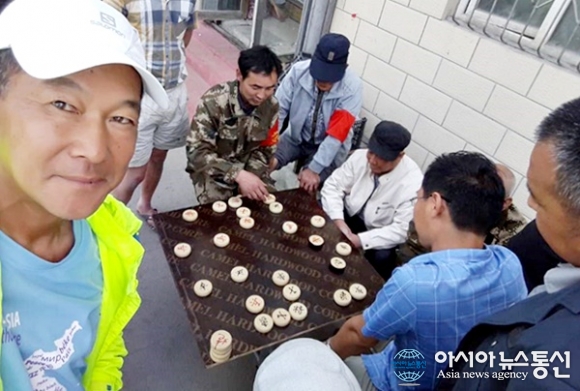 | 중국 호르고스 근처 마을을 지나다 만난 주민들이 길에 앉아 장기를 두고 있는 모습.(사진=강명구) |