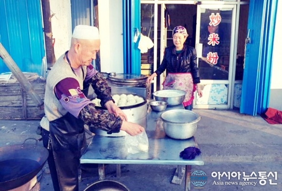 | 중국 서북부 신장 위그르 자치주의 한 식당에서 만두를 만들어 포장하고 있는 부부.(사진=강덕원) |