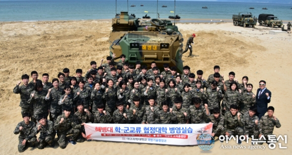 | 대구과학대학교 국방기술행정과 학생들이 지난달 28~31일까지 3박 4일간의 일정으로 포항 해병대교육훈련단에서 실시한 해병대 병영체험에서 KAAV(상륙장갑차)탑승 훈련 후 단체 기념촬영을 하고 있다.(사진제공=대구과학대학교) |