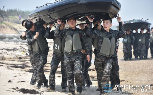 | 대구과학대학교 국방기술행정과 학생들이 지난달 28~31일까지 3박 4일간의 일정으로 포항 해병대교육훈련단에서 실시한 해병대 병영체험에서 IBS(소형고무보트) 운영술 훈련을 하고 있다.(사진제공=대구과학대학교) |